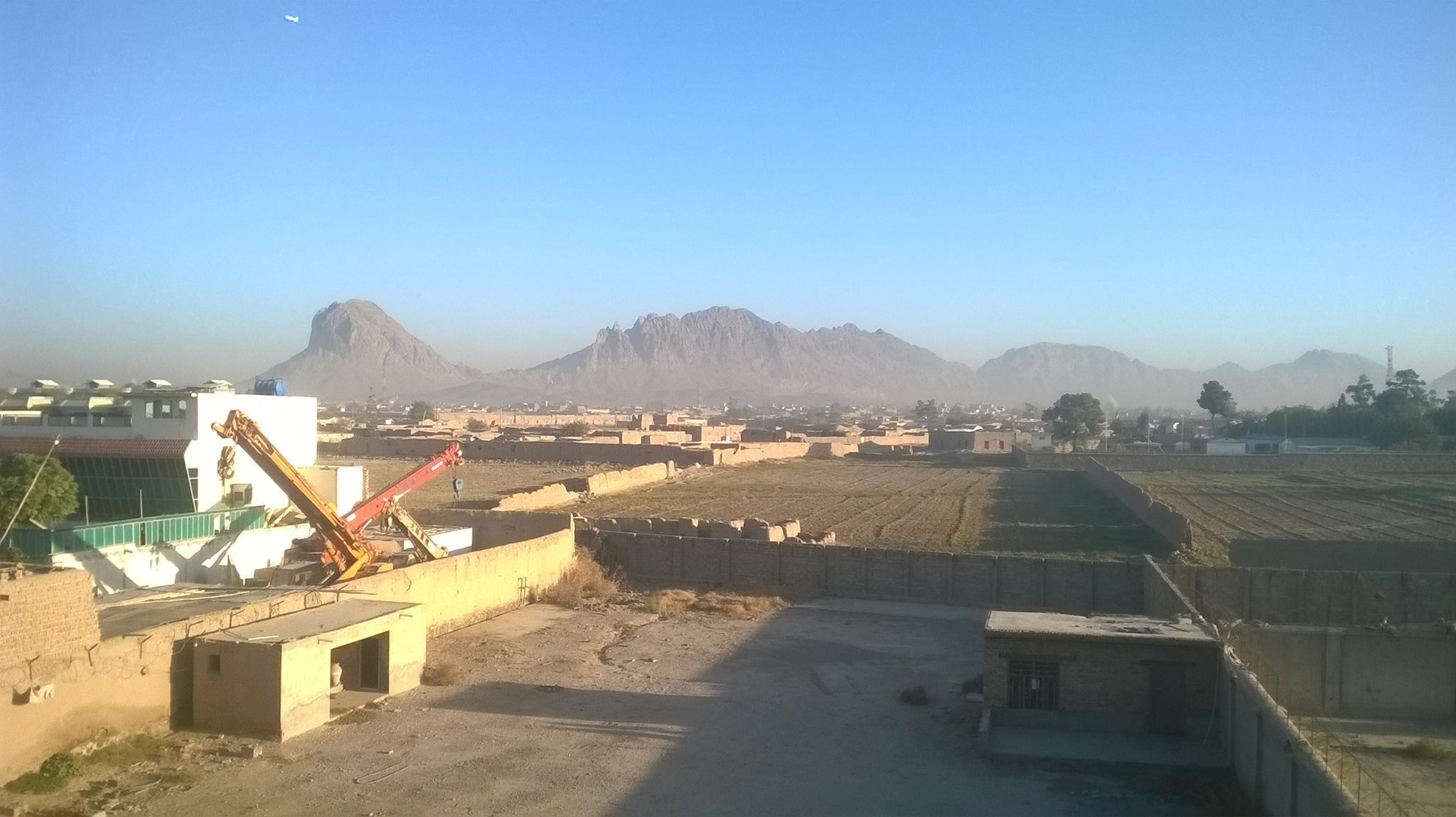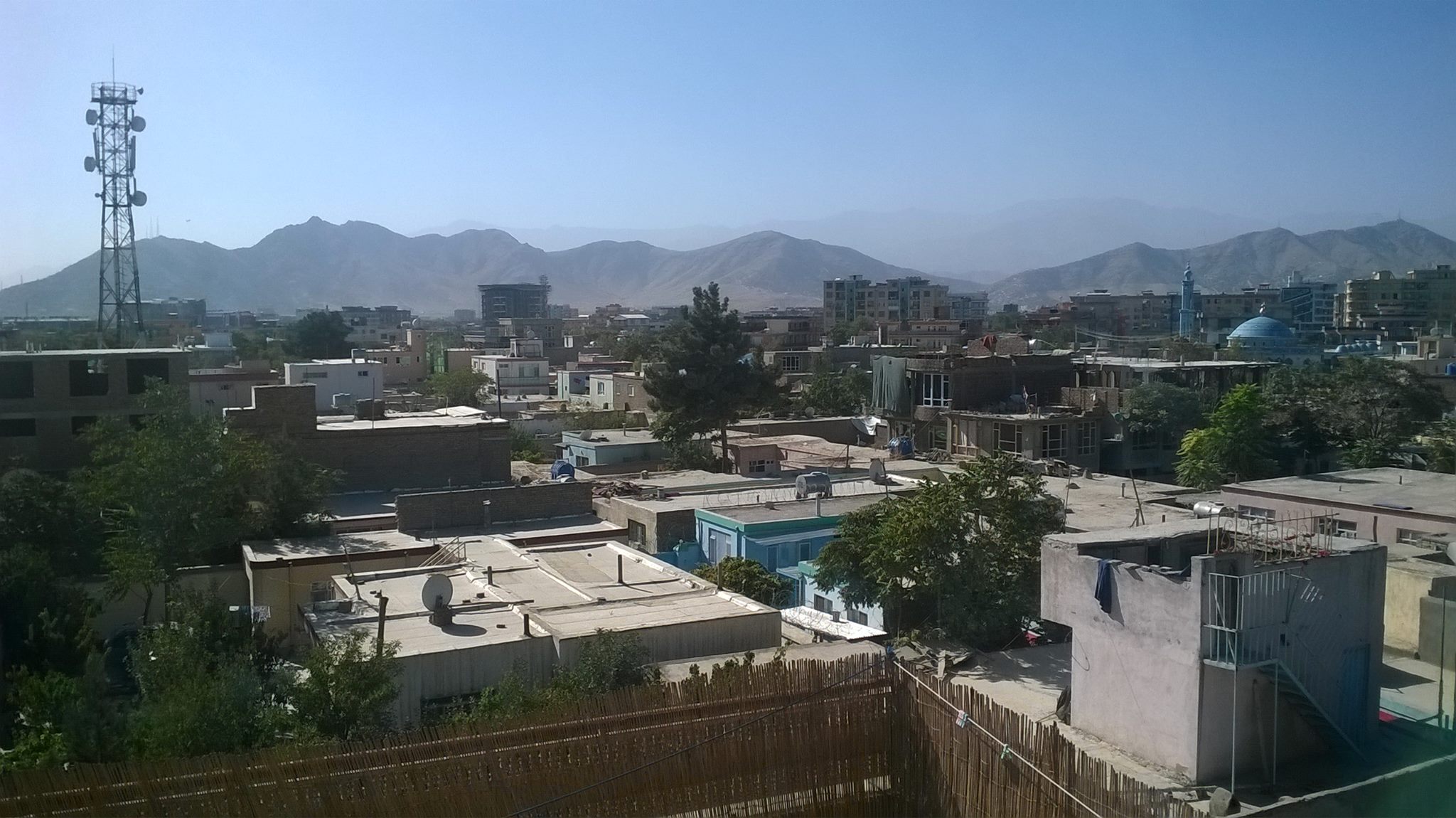 Jestem w Kabulu. 30 stopni w cieniu. Na razie niewiele widziałem, przyjechaliśmy kilka godzin temu. Nie ma żurku, ogórków kiszonych ani kapusty kiszonej. Nie ma nic, jest pięknie. -Znam już 2 słowa: Taszakur(dziękuję), masdoras (pyszne). -Widok z tarasu w domu w którym mieszkamy. Paczka papierosów kosztuje 1$.